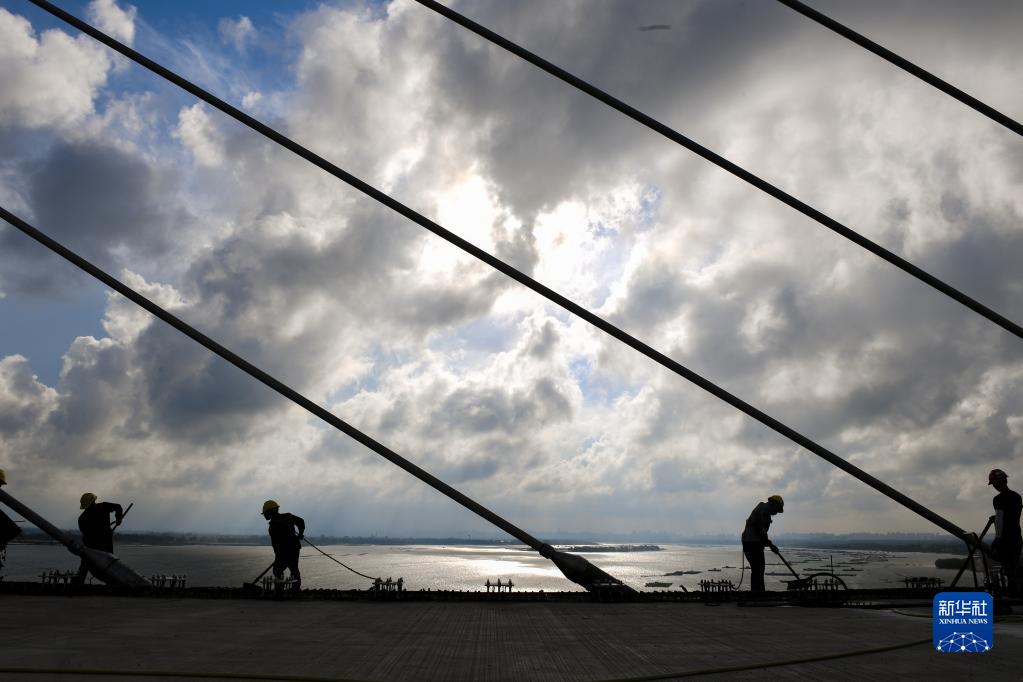 5月25日,建筑工人在鷺洲大橋修筑橋面。