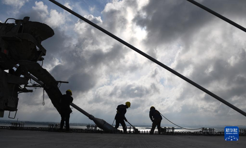 5月25日,建筑工人在鷺洲大橋修筑橋面。