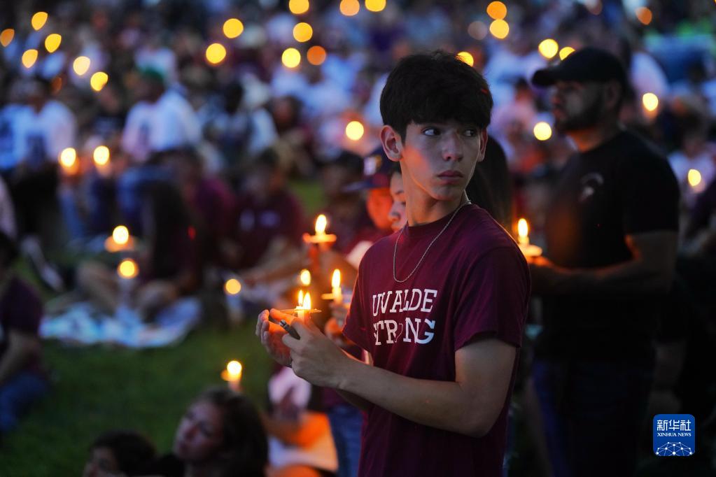 5月24日,在美國得克薩斯州小城尤瓦爾迪,人們參加守夜儀式悼念校園槍擊遇害者。