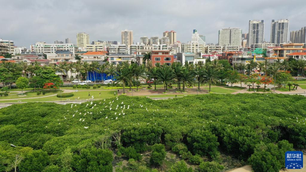 群鳥(niǎo)飛過(guò)湛江市區海邊的紅樹(shù)林(5月25日攝,無(wú)人機照片)。