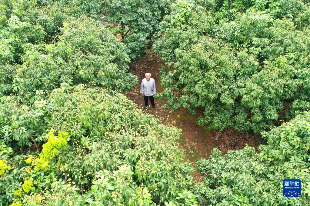 呂超錦在玉林市樟木鎮中村石奇嶺的石奇良種示范區查看荔枝長(cháng)勢(5月24日攝,無(wú)人機照片)。