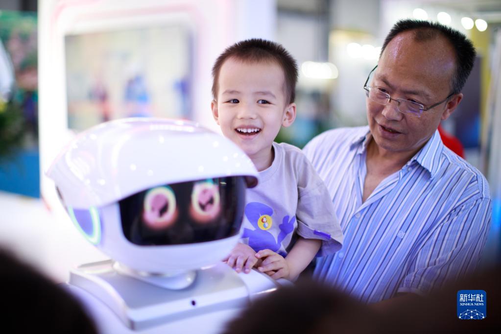 5月26日,一名小朋友在“數博會(huì )”上與智能機器人互動(dòng)。