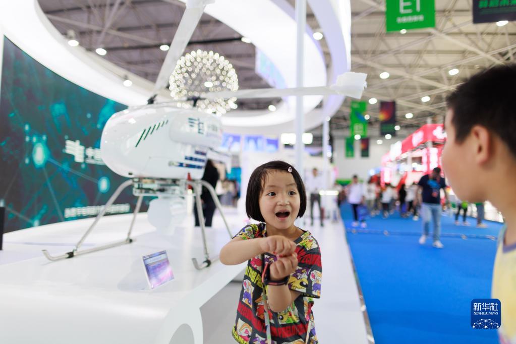 5月26日,兩名小朋友在“數博會(huì )”上參觀(guān)電力作業(yè)無(wú)人直升機。