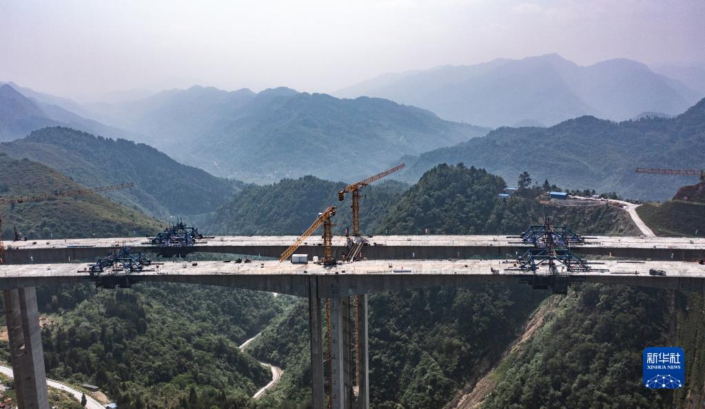5月27日拍攝的貴金古高速清池特大橋主橋連續剛構合龍現場(chǎng)(無(wú)人機照片)。