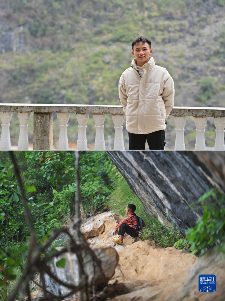 拼版照片:上圖為2023年1月16日,在大化瑤族自治縣板升鄉弄雷村,即將從技校畢業(yè)的蒙科佑站在家門(mén)口;下圖為2012年9月5日,在大化瑤族自治縣板升鄉弄雷村,10歲的蒙科佑在上學(xué)途中,坐在懸崖邊上休息。21歲的蒙科佑,希望能掙錢(qián)供弟弟妹妹讀書(shū),讓他們接受更好的教育。