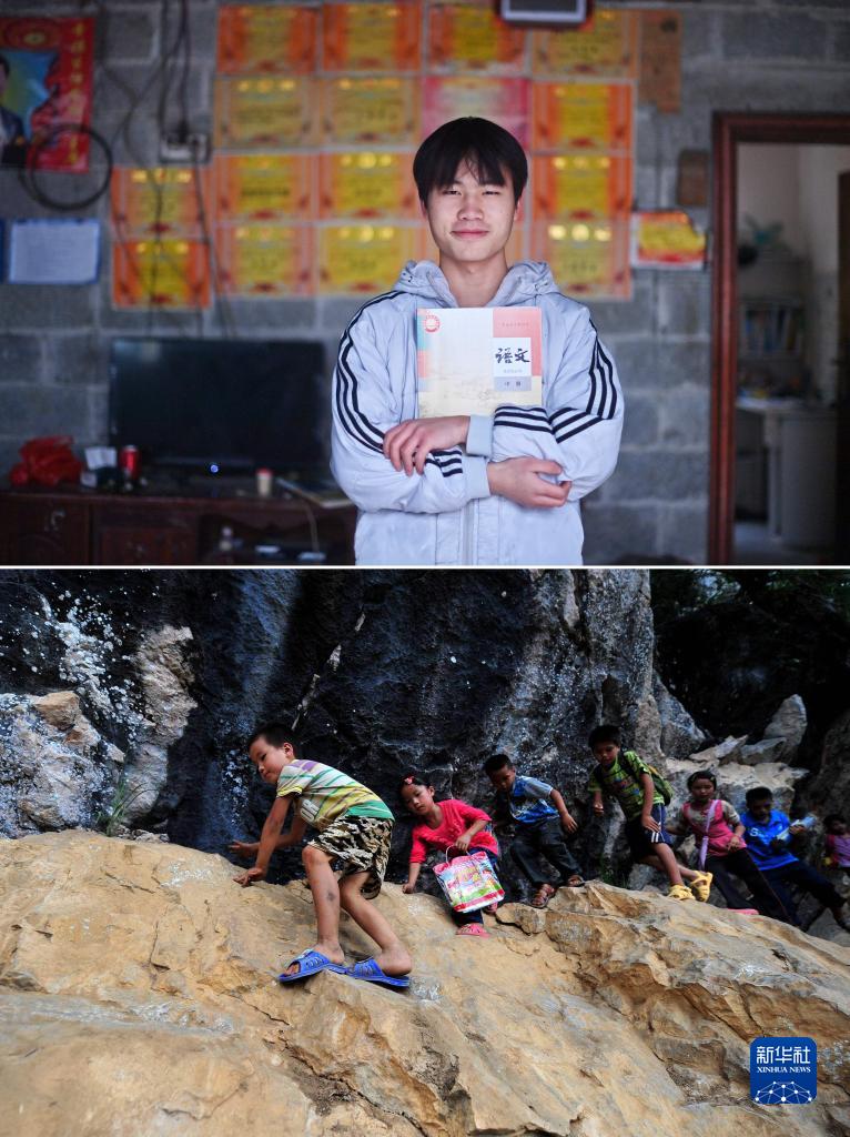 拼版照片:上圖為2023年1月26日,在大化瑤族自治縣板升鄉弄雷村,大化瑤族自治縣高級中學(xué)高二學(xué)生蒙文超站在家里,身后的墻上貼滿(mǎn)獎狀;下圖為2012年9月5日,在大化瑤族自治縣板升鄉弄雷村,7歲的蒙文超(左一)放學(xué)后爬懸崖回家。今年18歲的蒙文超最大的夢(mèng)想是一年后考上理想的大學(xué)。