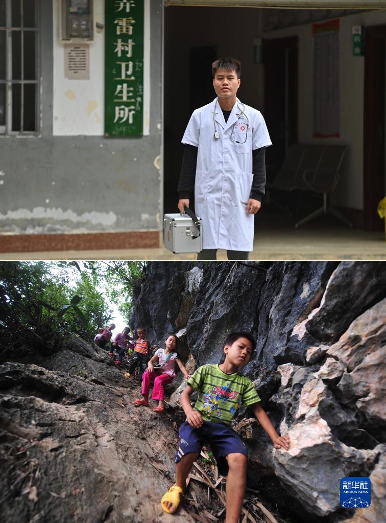 拼版照片:上圖為2023年5月24日,村醫蒙富松站在大化瑤族自治縣板升鄉弄雷村衛生所前(新華社記者胡星宇攝);下圖為2012年9月5日,10歲的蒙富松(右一)爬懸崖去學(xué)校讀書(shū)(新華社記者黃孝邦攝)。2021年,蒙富松從衛校畢業(yè),回到家鄉成為一名村醫。