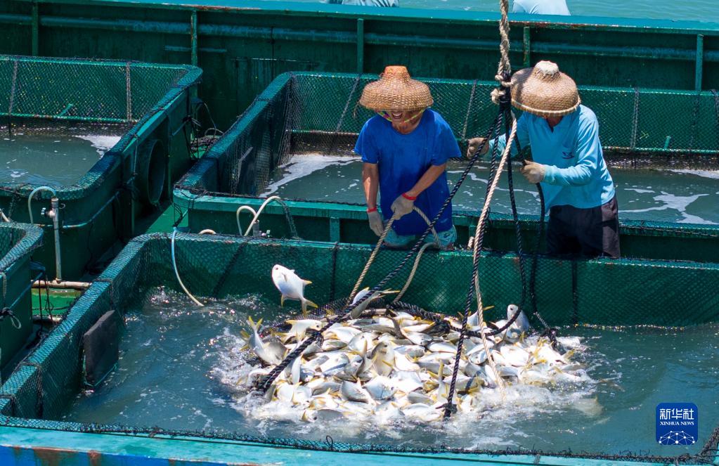 5月27日,在湛江市徐聞縣西連鎮,漁業(yè)工人將從深海網(wǎng)箱中打撈出的金鯧魚(yú)放入運輸船(無(wú)人機照片)。