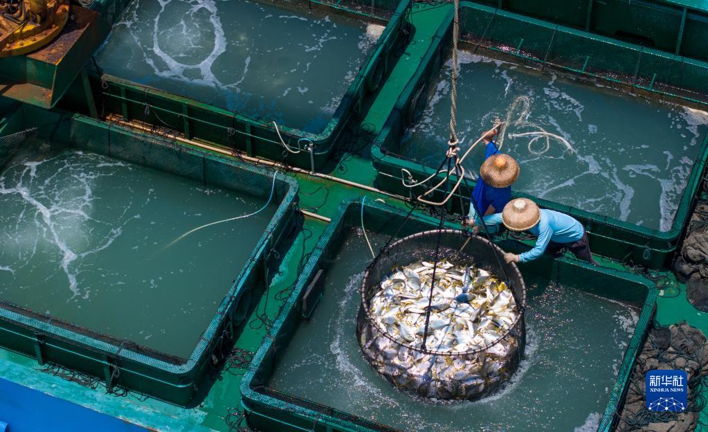 5月27日,在湛江市徐聞縣西連鎮,漁業(yè)工人將從深海網(wǎng)箱中打撈出的金鯧魚(yú)放入運輸船(無(wú)人機照片)。
