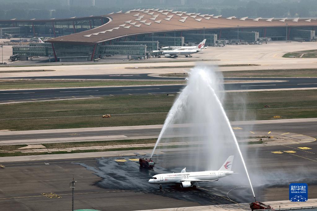 5月28日,北京首都國際機場(chǎng)以水門(mén)禮迎接C919首個(gè)商業(yè)航班東航MU9191。