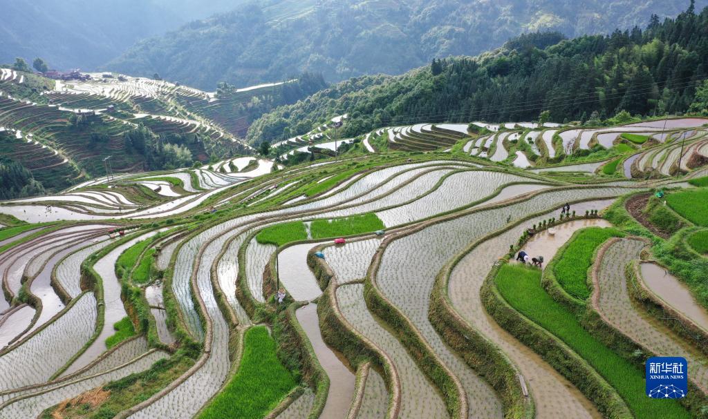 貴州省黔東南苗族侗族自治州從江縣加榜鄉加頁(yè)村梯田風(fēng)光(5月27日攝,無(wú)人機照片)。