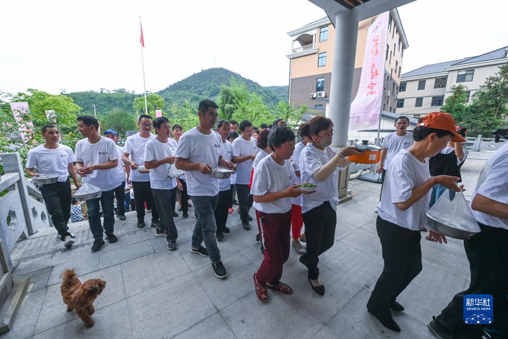 5月27日,梅坪村的村民拿著(zhù)各家烹制的菜肴進(jìn)入新建成的文化中心內的村文化禮堂,參加百家宴活動(dòng)。