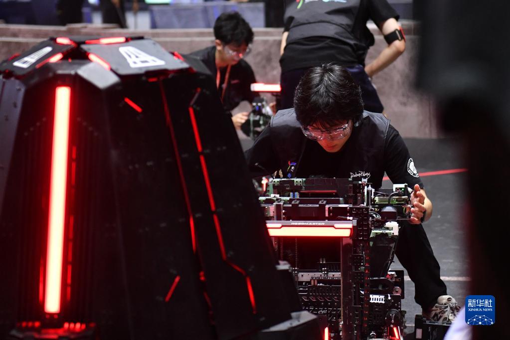 5月28日,深圳大學(xué)RobotPilots戰隊隊員在比賽間隙調整機器人。