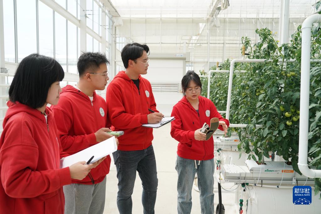 在位于平谷區峪口鎮的京瓦溫室園藝示范園,西樊各莊科技小院的大學(xué)生交流工作(5月9日攝)。