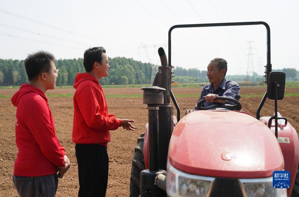 在峪口鎮西樊各莊村,西樊各莊科技小院駐村大學(xué)生王萌(中)與陶閱兵(左)與當地村民交流播種計劃(5月24日攝)。