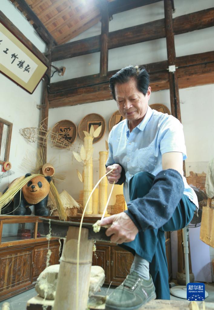 5月24日,在衢州市龍游縣溪口鎮溪口老街,竹編手藝人徐明光在竹居生活館“一盒故鄉”中創(chuàng )作。新華社記者 鄭衛 攝