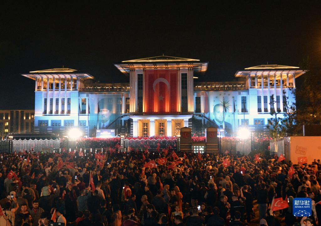 5月28日晚,土耳其總統埃爾多安的支持者在位于安卡拉的總統府前慶祝。
