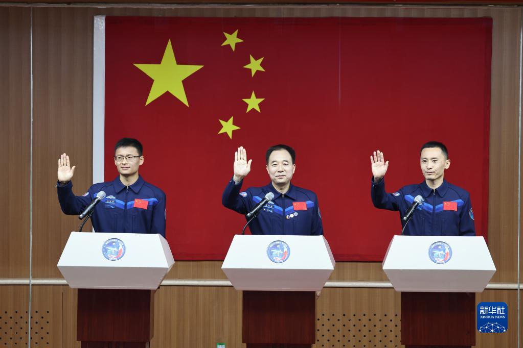 5月29日,神舟十六號航天員乘組與中外媒體記者集體見(jiàn)面會(huì )在酒泉衛星發(fā)射中心問(wèn)天閣舉行。這是指令長(cháng)景海鵬(中)、航天飛行工程師朱楊柱(右)、載荷專(zhuān)家桂海潮揮手致意。