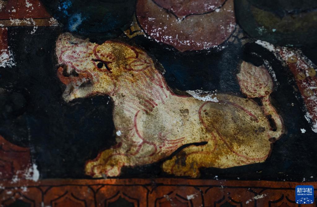 這是5月26日拍攝的皮央石窟壁畫(huà)中的獅子像。