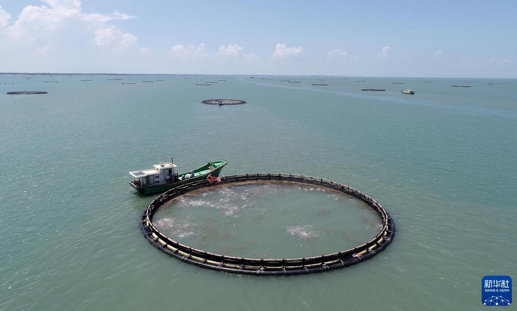 在湛江市徐聞縣西連鎮的“海上牧場(chǎng)”,漁業(yè)工人在喂魚(yú)(5月27日攝,無(wú)人機照片)。