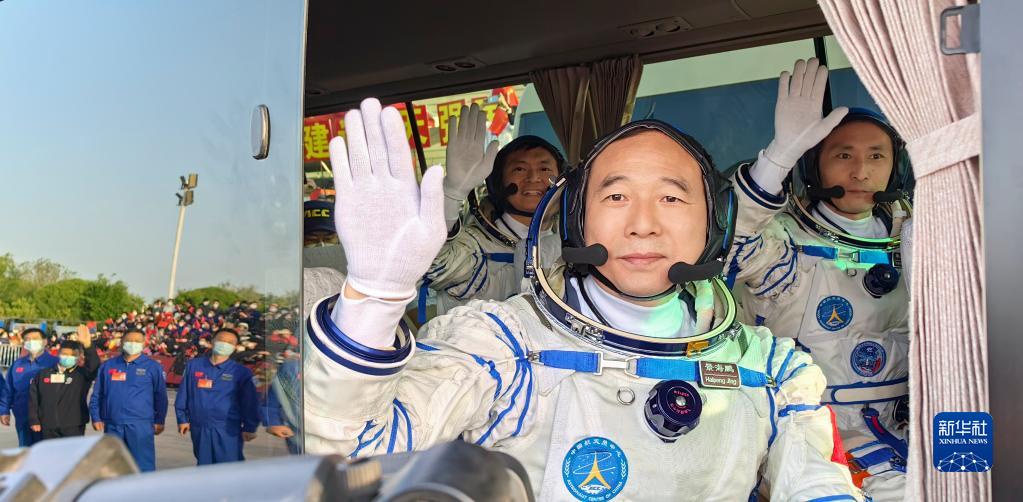 5月30日6時(shí)42分,神舟十六號載人飛行任務(wù)航天員乘組出征儀式在酒泉衛星發(fā)射中心問(wèn)天閣圓夢(mèng)園廣場(chǎng)舉行。這是航天員景海鵬(前)、朱楊柱(后右)、桂海潮在出征儀式上。