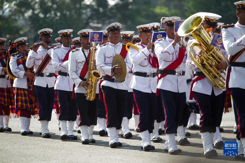 5月29日,警察樂(lè )隊在尼泊爾加德滿(mǎn)都舉行的共和日慶?;顒?dòng)上演奏。
