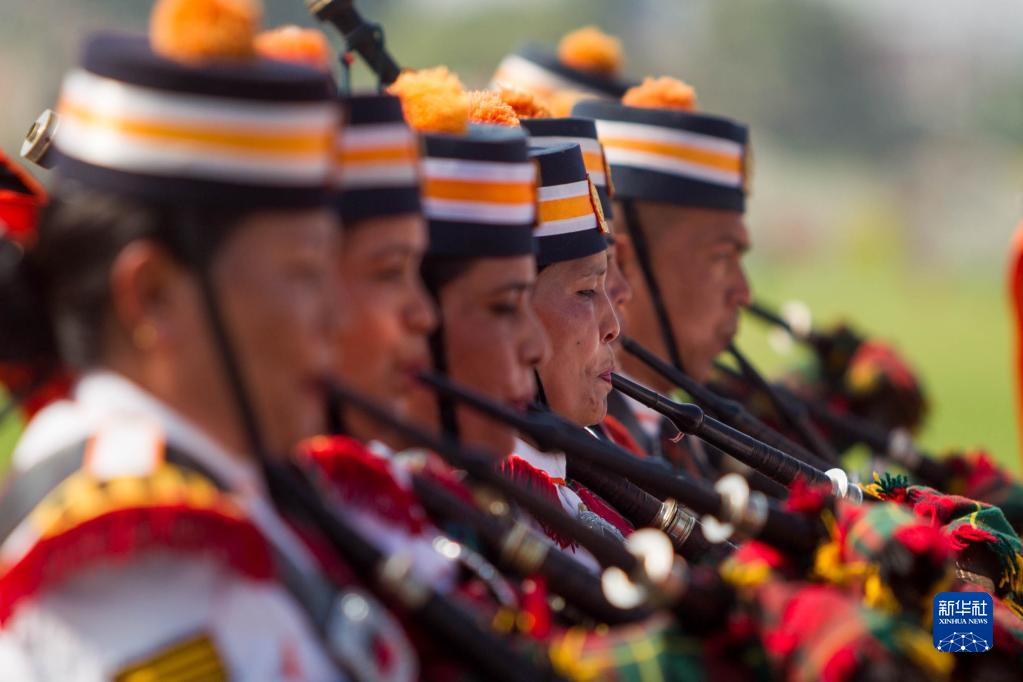 5月29日,警察樂(lè )隊在尼泊爾加德滿(mǎn)都舉行的共和日慶?;顒?dòng)上演奏。
