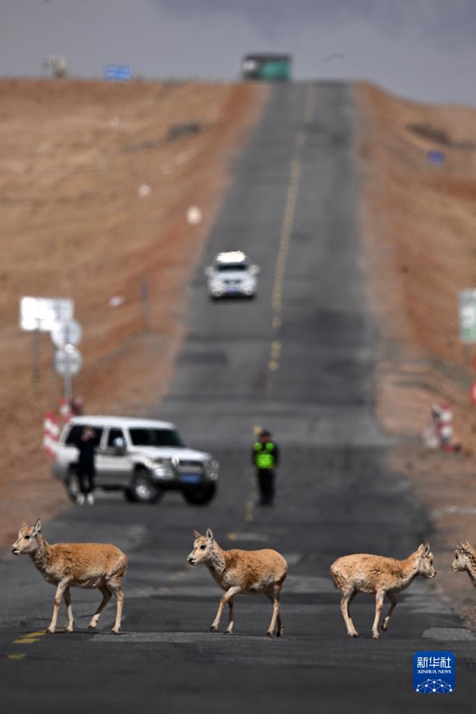 5月28日,在青??煽晌骼?,一群雌性待產(chǎn)藏羚羊通過(guò)青藏公路。