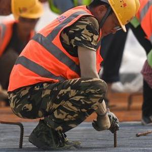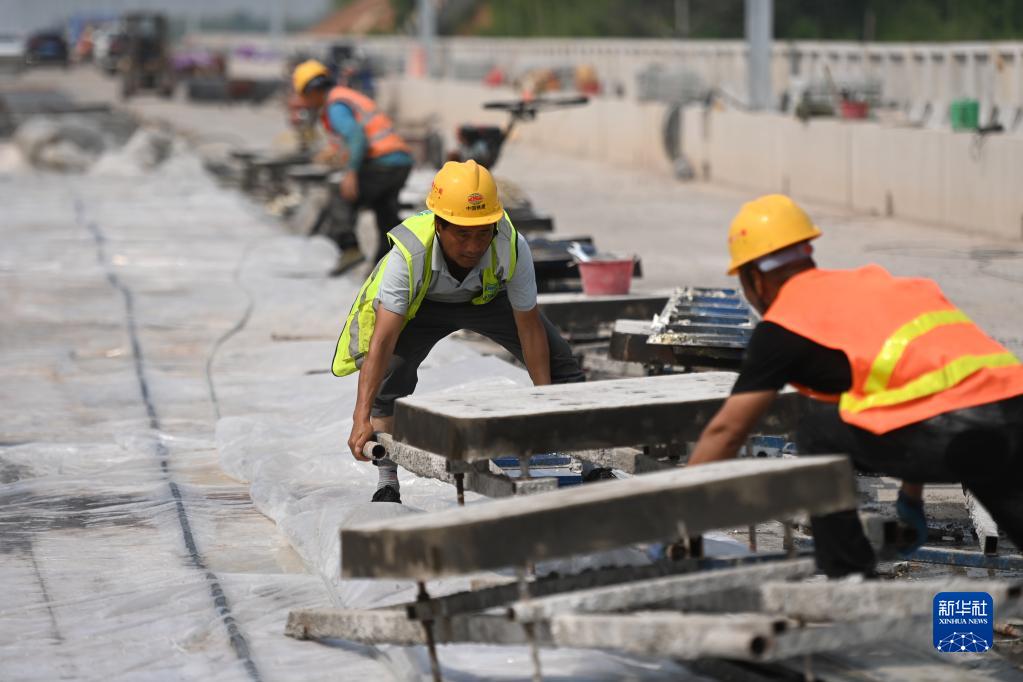 5月30日,中鐵十一局的建設者在杭衢鐵路無(wú)砟軌道施工現場(chǎng)作業(yè)。