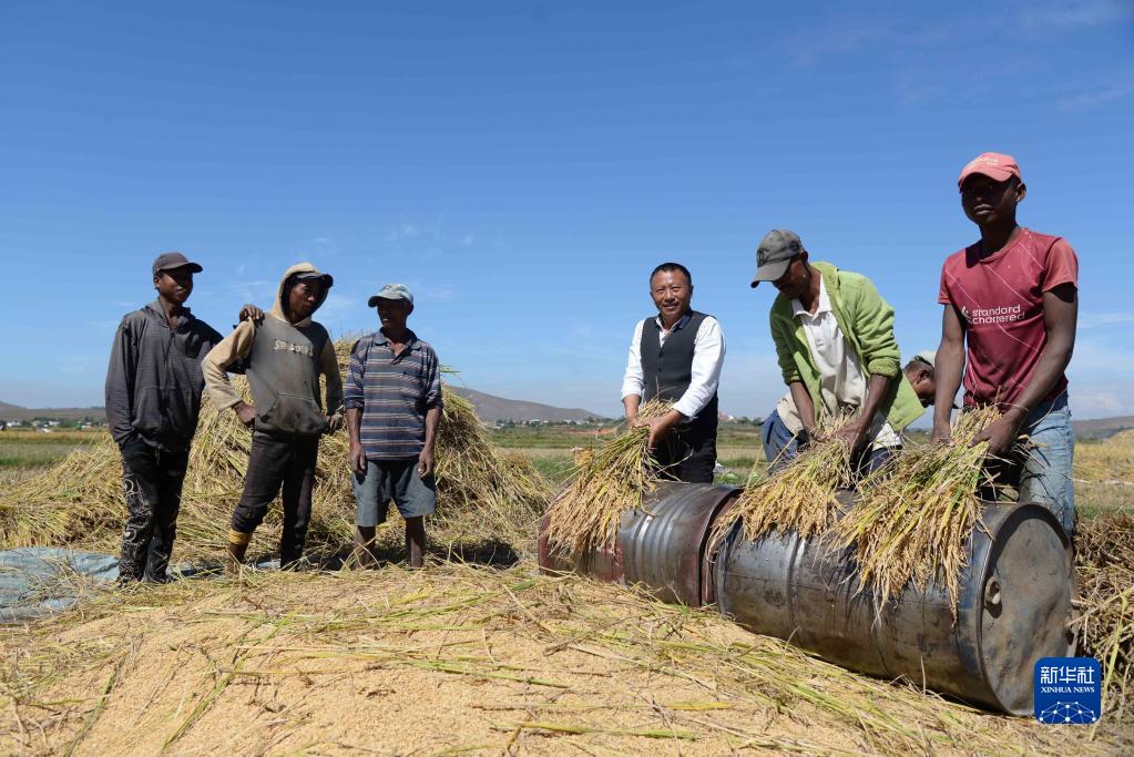 5月12日,在馬達加斯加首都塔那那利佛附近的馬義奇鎮,中國雜交水稻技術(shù)專(zhuān)家胡月舫(右三)在中國國家雜交水稻工程技術(shù)研究中心非洲分中心的試驗田里和當地農民一起收獲水稻。