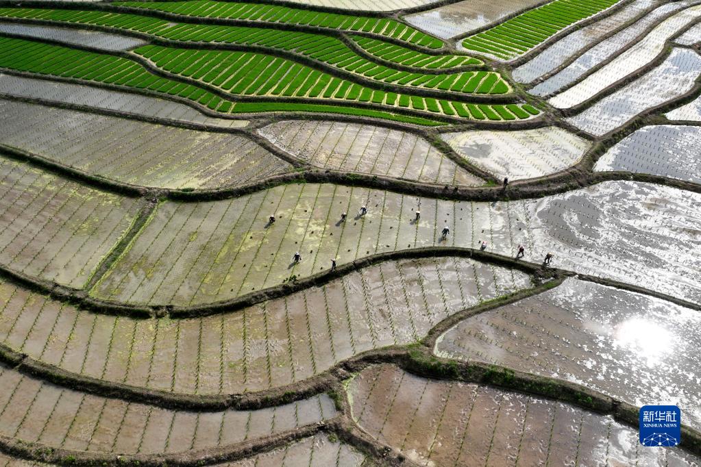 5月29日,村民在岑鞏縣水尾鎮新場(chǎng)村的雜交水稻制種基地勞作(無(wú)人機照片)。