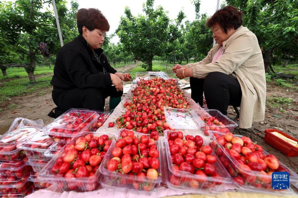 5月30日,在石家莊市欒城區西宮村一家櫻桃采摘園,工作人員分揀打包櫻桃。