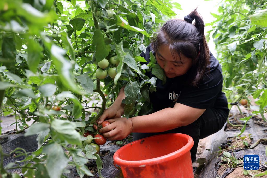 5月30日,在石家莊市欒城區崗頭村一家農業(yè)采摘園,工作人員采摘西紅柿。