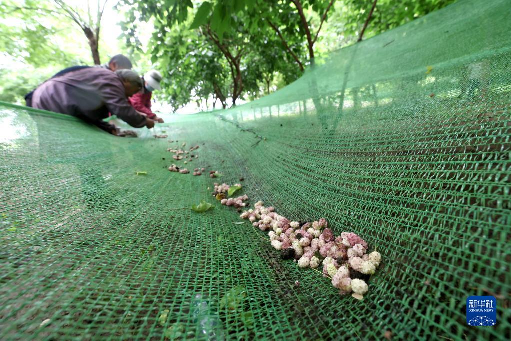 5月30日,在石家莊市欒城區后牛村桑葚采摘園,工作人員采收桑葚。