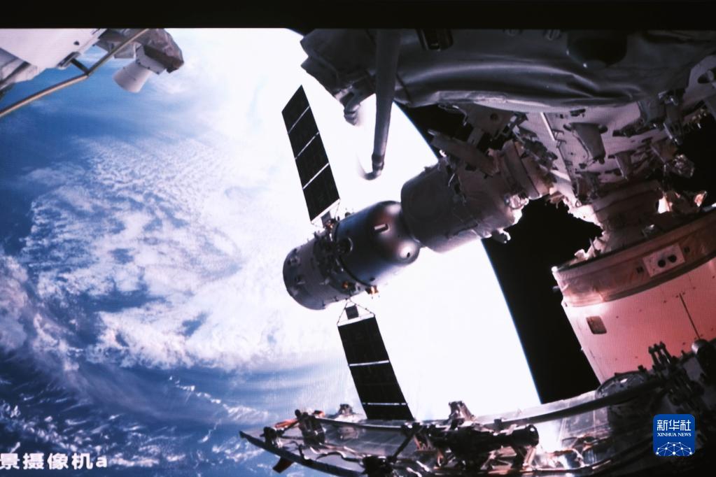 5月30日在北京航天飛行控制中心拍攝的神舟十六號載人飛船成功對接于空間站天和核心艙徑向端口的畫(huà)面。