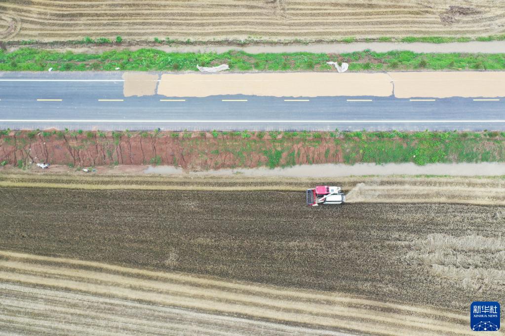 5月30日,在河南省駐馬店市正陽(yáng)縣銅鐘鎮,收割機在搶收小麥(無(wú)人機照片)。