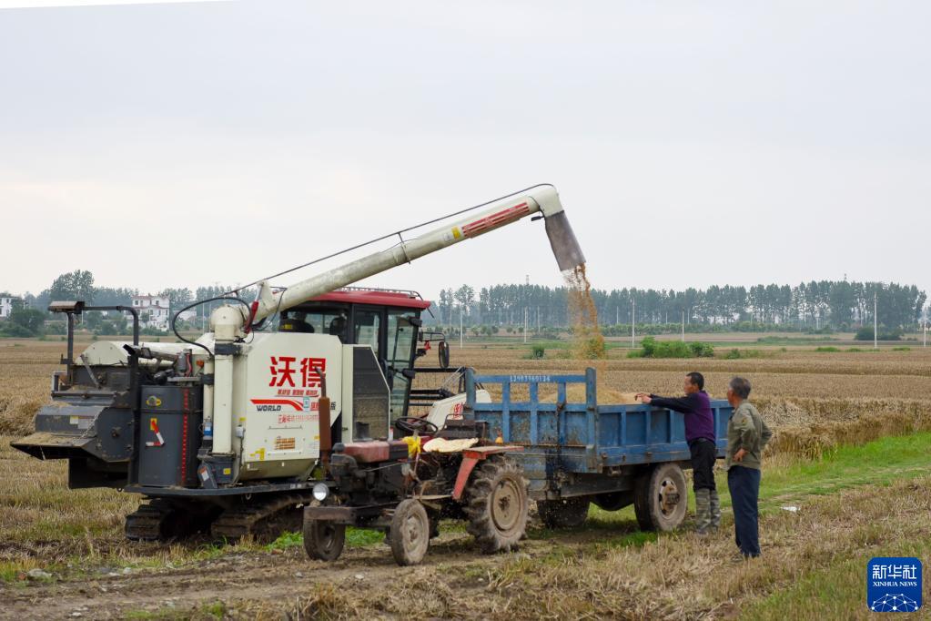 5月30日,在河南省駐馬店市正陽(yáng)縣銅鐘鎮,收割機將收獲的小麥裝車(chē)。