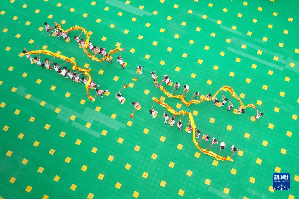 5月30日,在河北省唐山市豐潤區左家塢鎮中心幼兒園,孩子們在表演舞龍節目(無(wú)人機照片)。