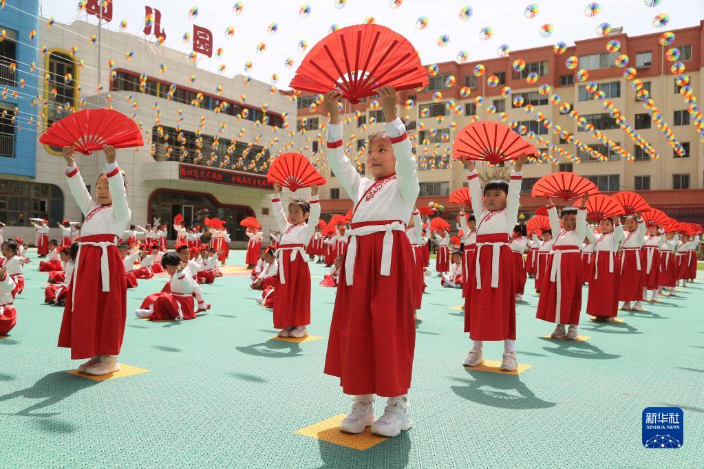 5月30日,甘肅省定西市安定區中華路幼兒園的小朋友在表演節目。