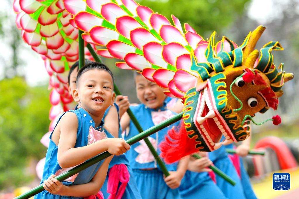 5月31日,在浙江省湖州市長(cháng)興縣林城鎮中心幼兒園,孩子們歡舞百葉龍。