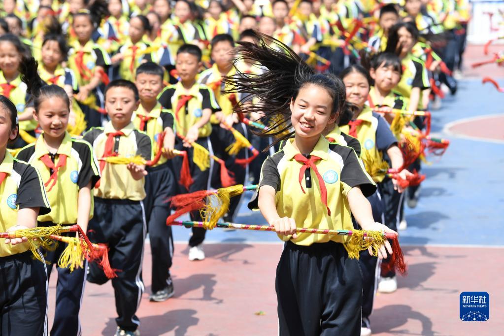 5月31日,在貴州省遵義市余慶縣龍溪小學(xué),學(xué)生們在“六一”活動(dòng)上表演“龍溪錢(qián)桿舞”。