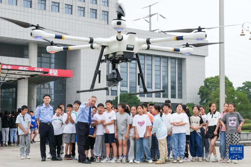 5月31日,在江蘇省丹陽(yáng)市公安局,參加探訪(fǎng)警營(yíng)活動(dòng)的小學(xué)生們在聽(tīng)警用無(wú)人機介紹。