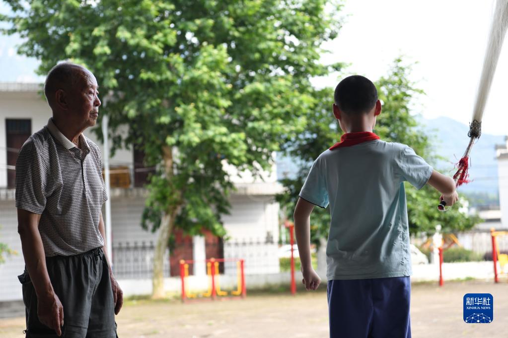 5月29日,民間老藝人邵千峰(左)在徽劇展演排練時(shí)指導一名伏嶺鎮中心小學(xué)“徽劇童子班”的學(xué)生。