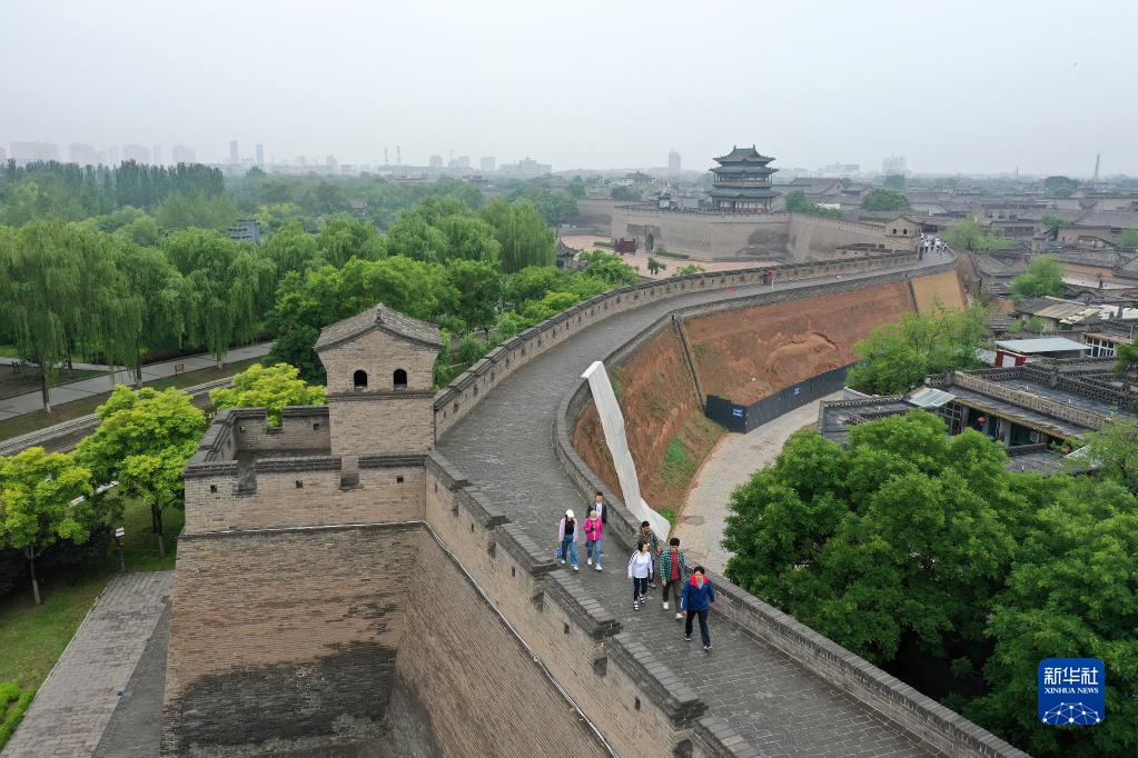 游客在平遙古城城墻上游覽(5月30日攝,無(wú)人機照片)。
