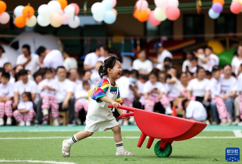 5月31日,在合肥市長(cháng)江東大街幼兒園舉辦的“萌娃迎六一”活動(dòng)中,小朋友參加趣味推車(chē)游戲。