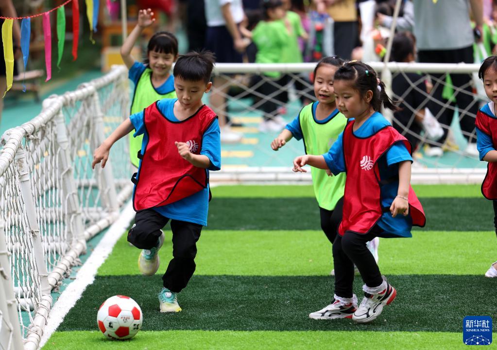 5月31日,在石家莊市長(cháng)安區第一幼兒園,孩子們進(jìn)行快樂(lè )足球游戲。