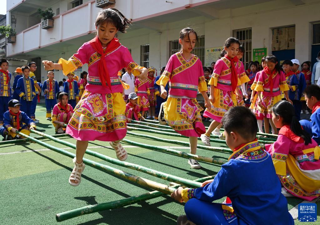 5月30日,在廣西羅城仫佬族自治縣第二小學(xué),學(xué)生參加跳竹竿舞比賽。