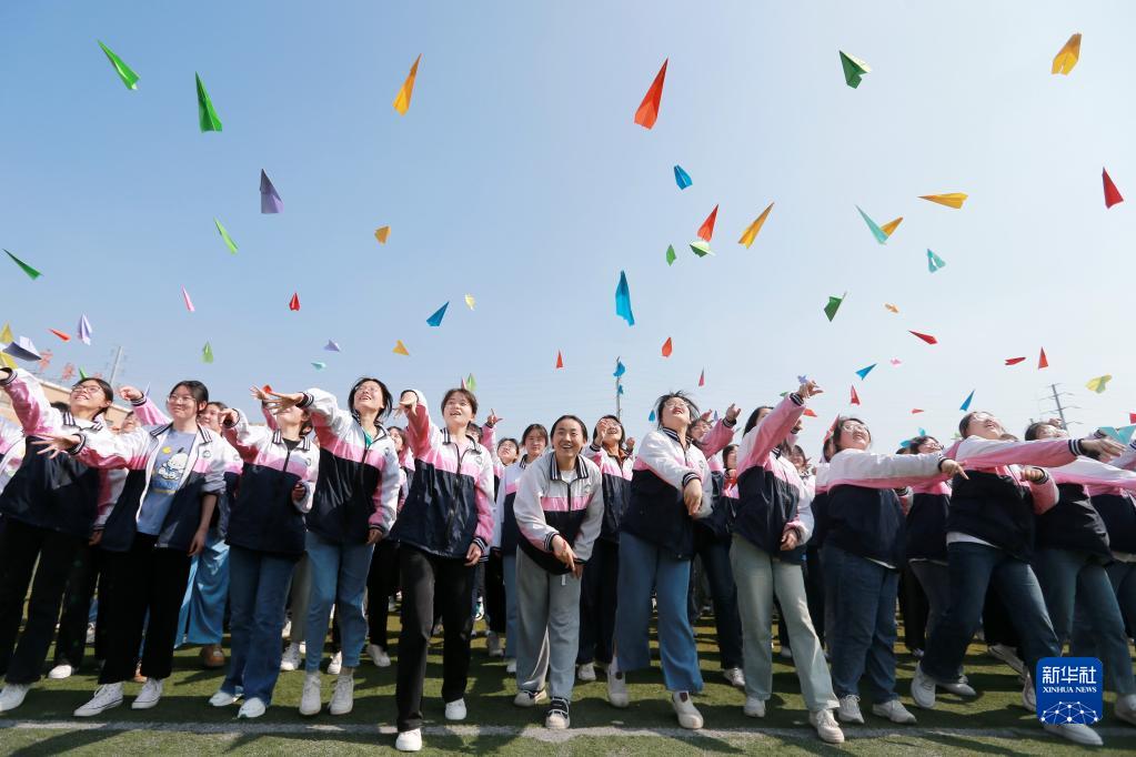 5月31日,在淮北市第十二中學(xué),高三學(xué)生在操場(chǎng)上扔紙飛機。