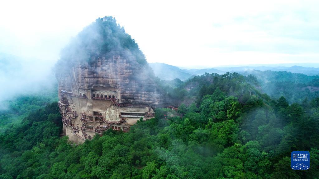 這是5月31日拍攝的煙雨籠罩下的麥積山石窟(無(wú)人機照片)。