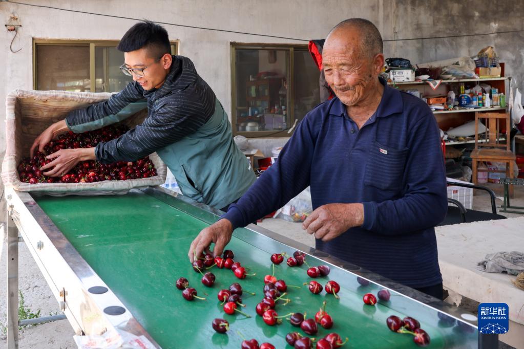 5月31日,燕崖鎮果農王貴金和爺爺使用機器分揀剛采摘的櫻桃。